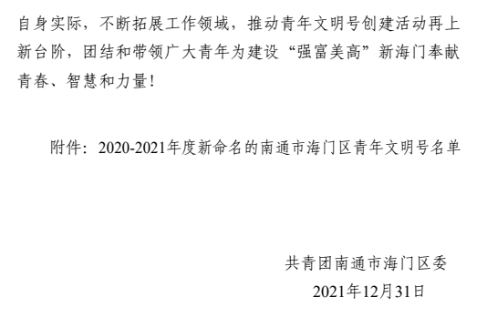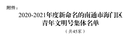 近日,共青团南通市海门区委下发通知,命名45个创建集体为2020-2021年度南通市海门区青年文明号,南通市海门嘉海物业管理有限公司青年工作小组榜上有名。
